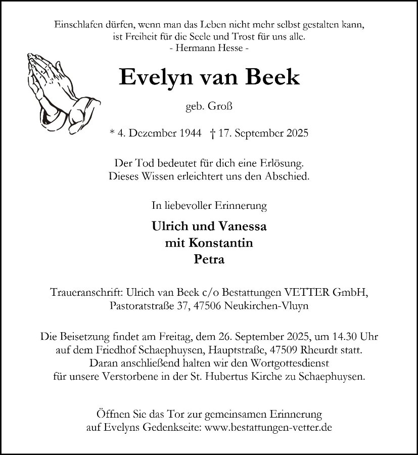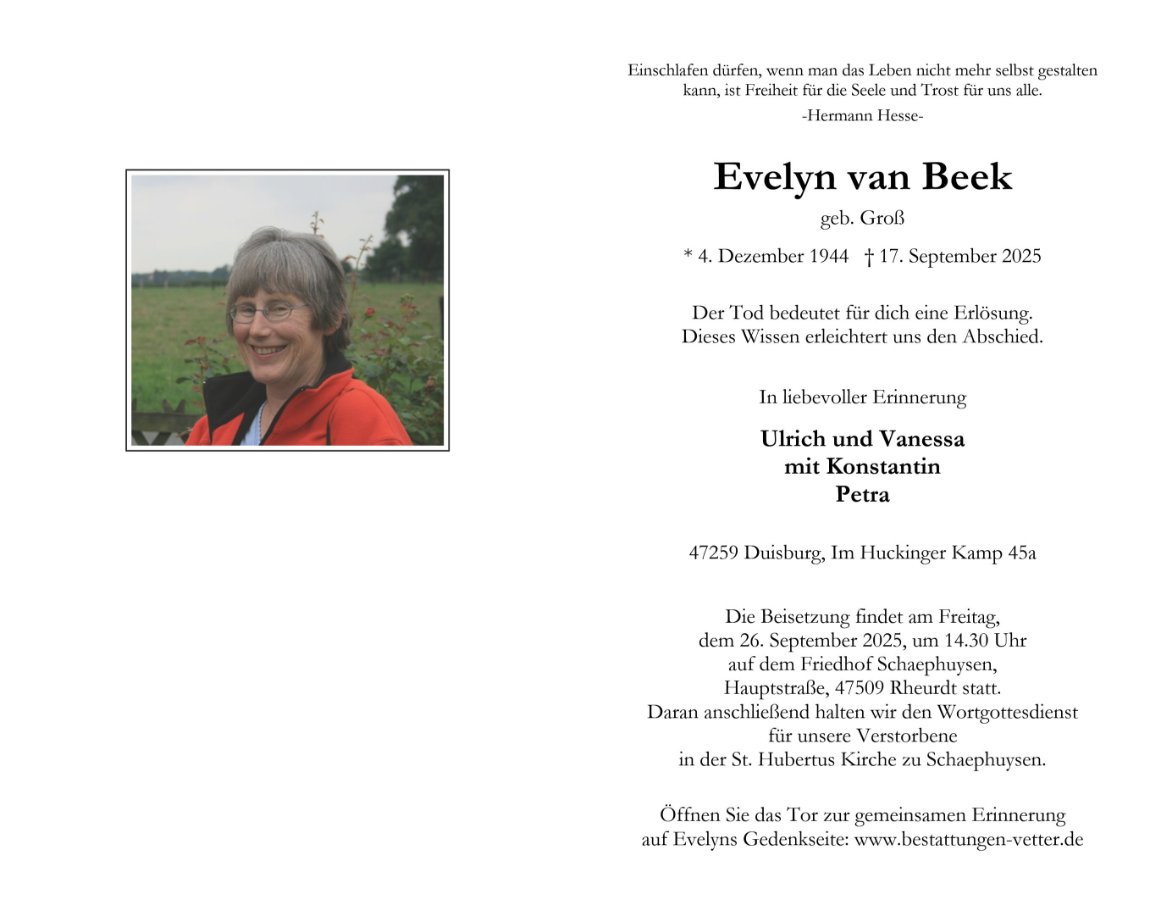 In liebevoller Erinnerung an EviDeine Zeit auf Erden ging viel zu schnell vorüber.Wir tragen dich im Herzen und denken voller Liebe an dich.Ruhe in Frieden – unvergessen.Karin & Manfred